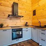 W willi znajdują się miejsce do jedzenia z piekarnikiem, płytą grzejną i szklanymi naczyniami.